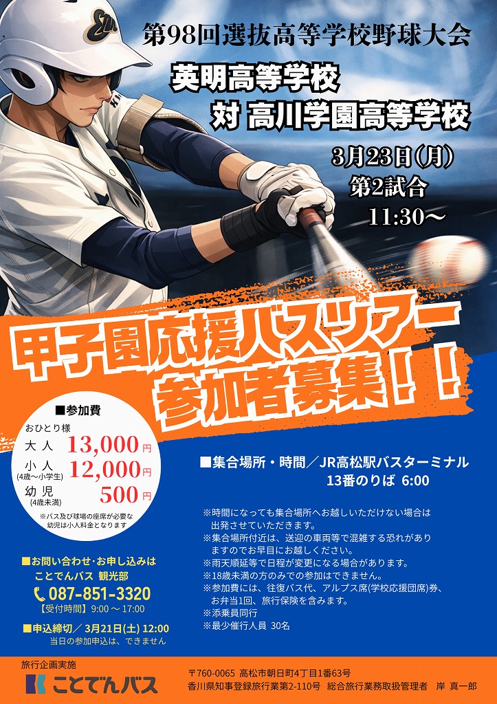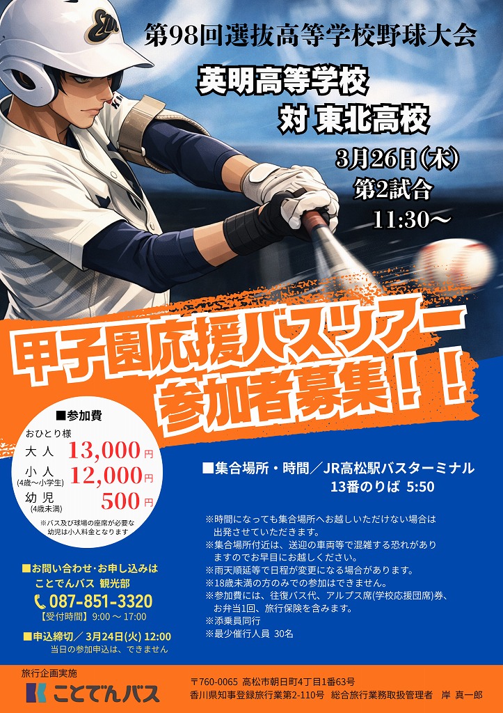 第98回選抜高等学校野球大会に香川県代表として、英明高等学校野球部が出場されます。 ことでんバスでは、JR高松駅発着の英明高等学校甲子園応援バスツアーを企画いたしました。 スタンドから皆様の熱い声援を届けましょう!