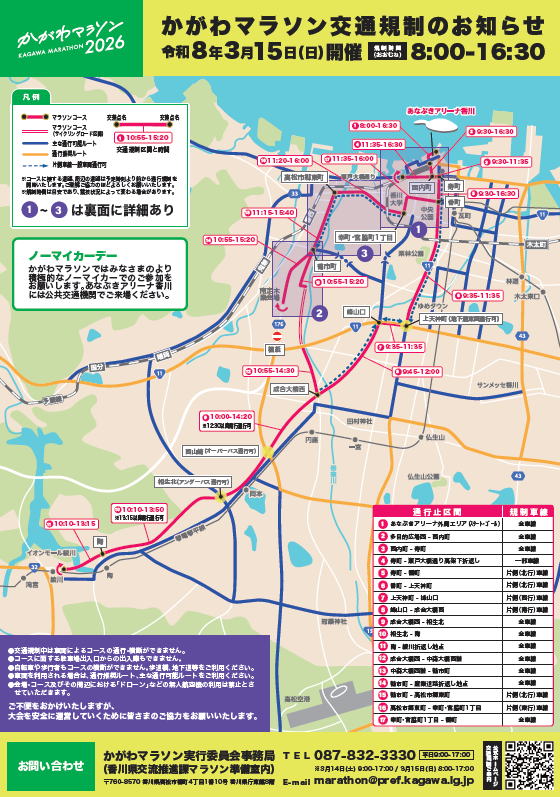 かがわマラソン2026開催に伴う交通規制が行われるため、2026年3月15日(日)は、一部路線において