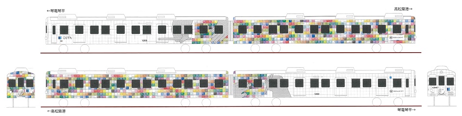 香川県の作家・山内雅人氏の「アート」と、新たな景色につながる「問い」で車両をラッピング。おや?と、眺めていただけたら、