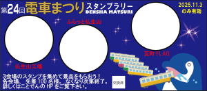 ことでん電車まつりで、仏生山車両所、瓦町FLAG屋上、ふらっと仏生山の3会場を回ってスタンプを押した方に各会場限定100名様にプレゼントを差し上げます。