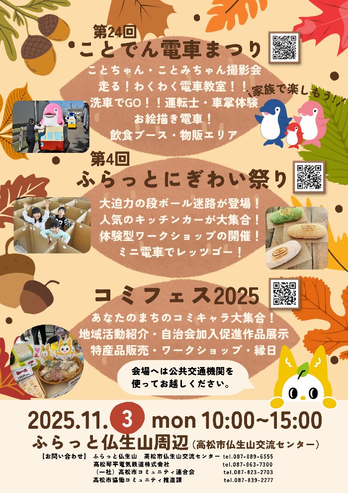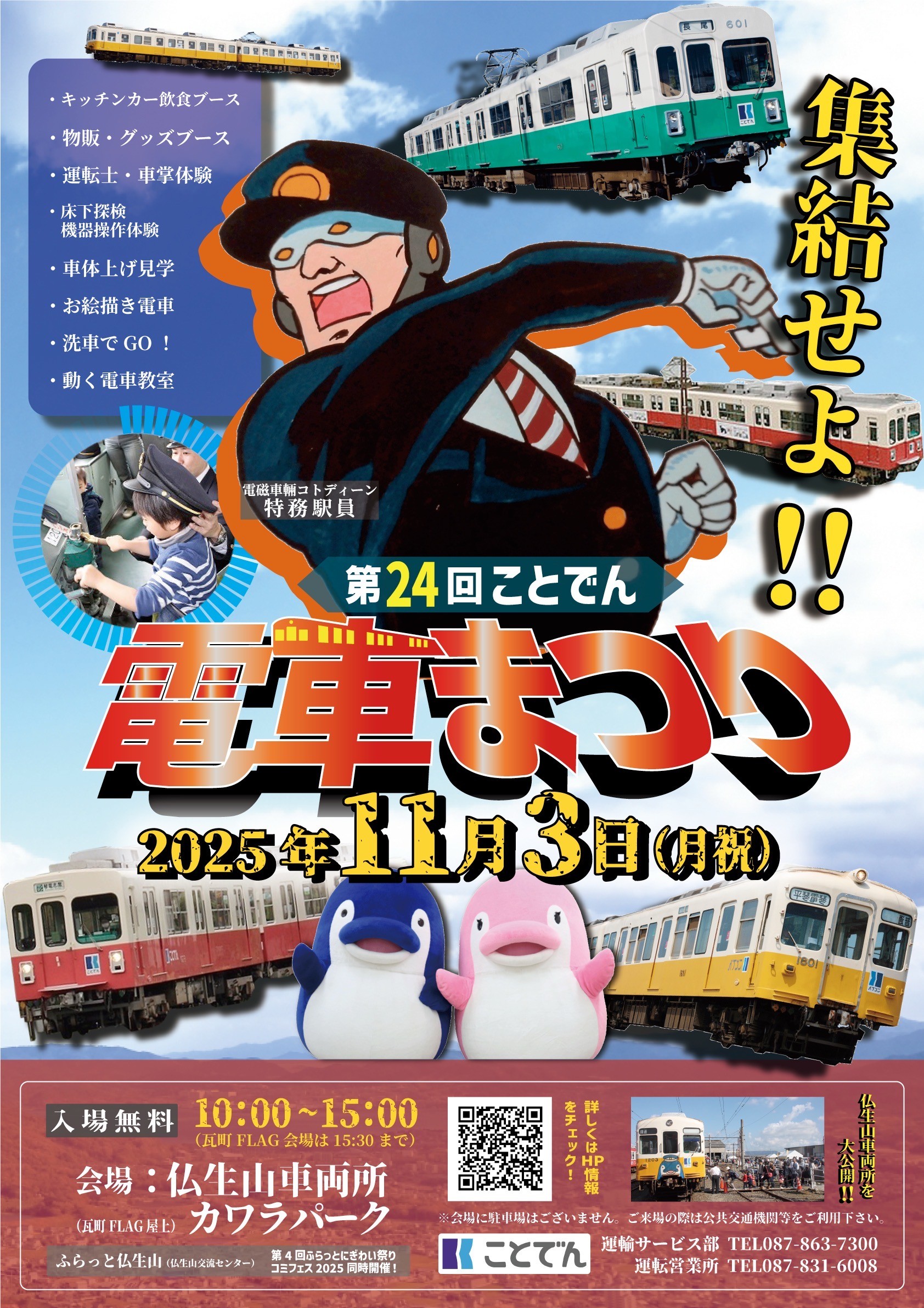 | 今年も下記内容で「ことでん電車まつり」を開催いたします。皆様にお楽しみいただける催しを計画しておりますのでご家族、ご友人お誘いあわせの上ぜひご参加下さい。詳細は決まり次第随時更新してまいります。 |