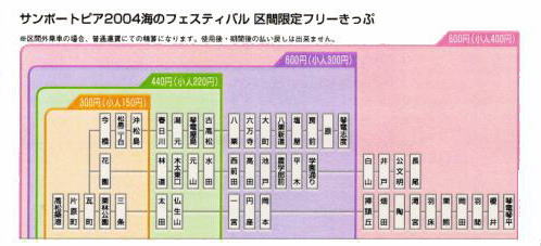 | 「ことでん」では、サンポート高松にて開催のイベント「サンポートピア2004海のフェスティバル」にあわせてお客様へのサービスと 地域の活性のために割引乗車券を発売いたします。 今回は、初めて区間内乗り放題の割引乗車券です!是非ご利用ください ヽ(^o^)丿 |