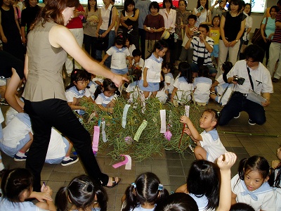 | 光華幼稚園の園児が幼稚園で作った七夕かざりを持って来て、瓦町駅の笹にかざり付けをしてくれました 瓦町駅は他に栗林幼稚園・松福保育園・屋島保育園・若葉保育園の皆様にかざりつけを作っていただきました |